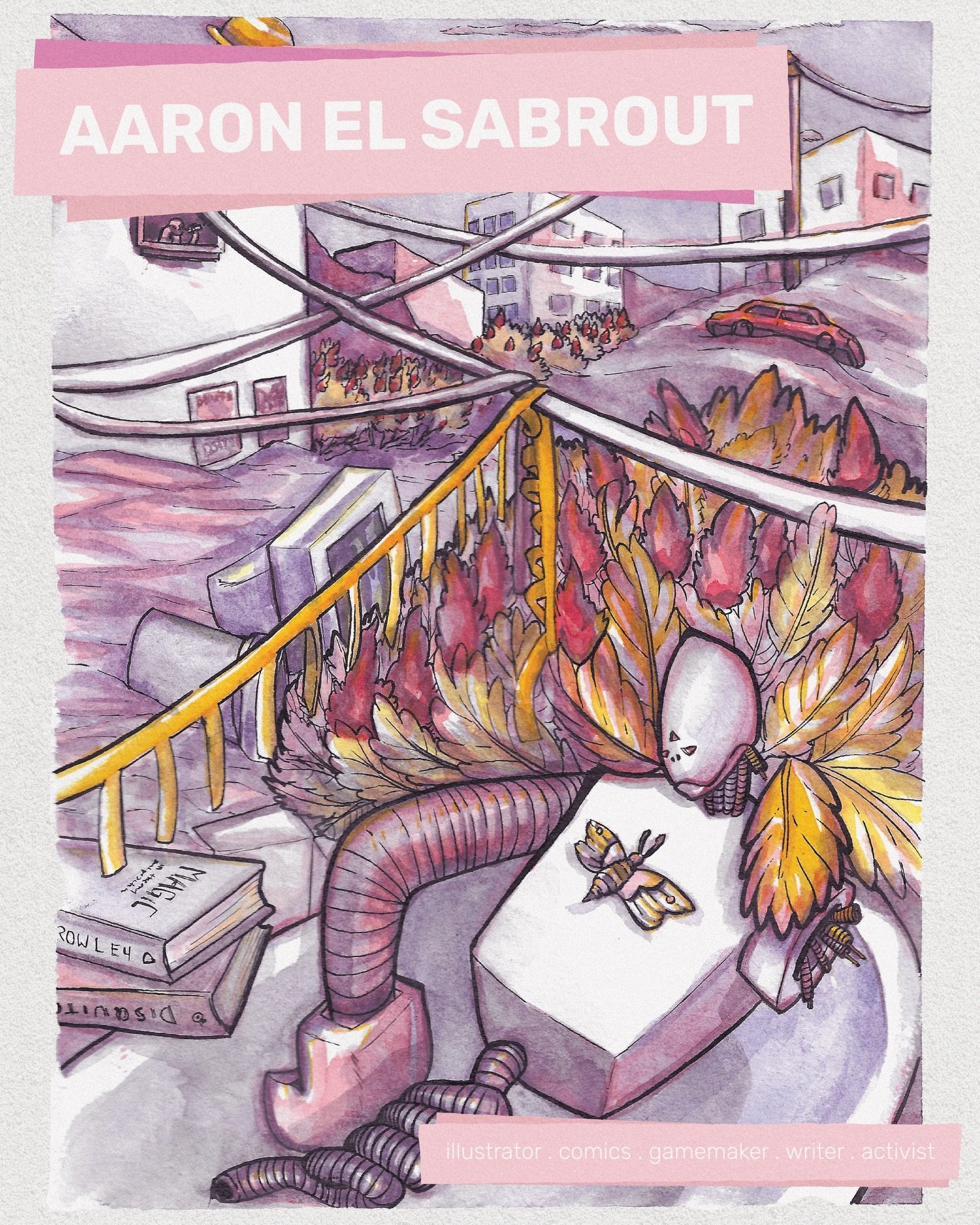 Aaron El Sabrout is an Egyptian-American visual artist and community activist who has been working at the intersection of racial justice, queer issues, housing and food justice for many years. All his work depicts and reflects these issues and experiences, particularly those examining the relationship between queer/trans people of color, our bodies and the land.
