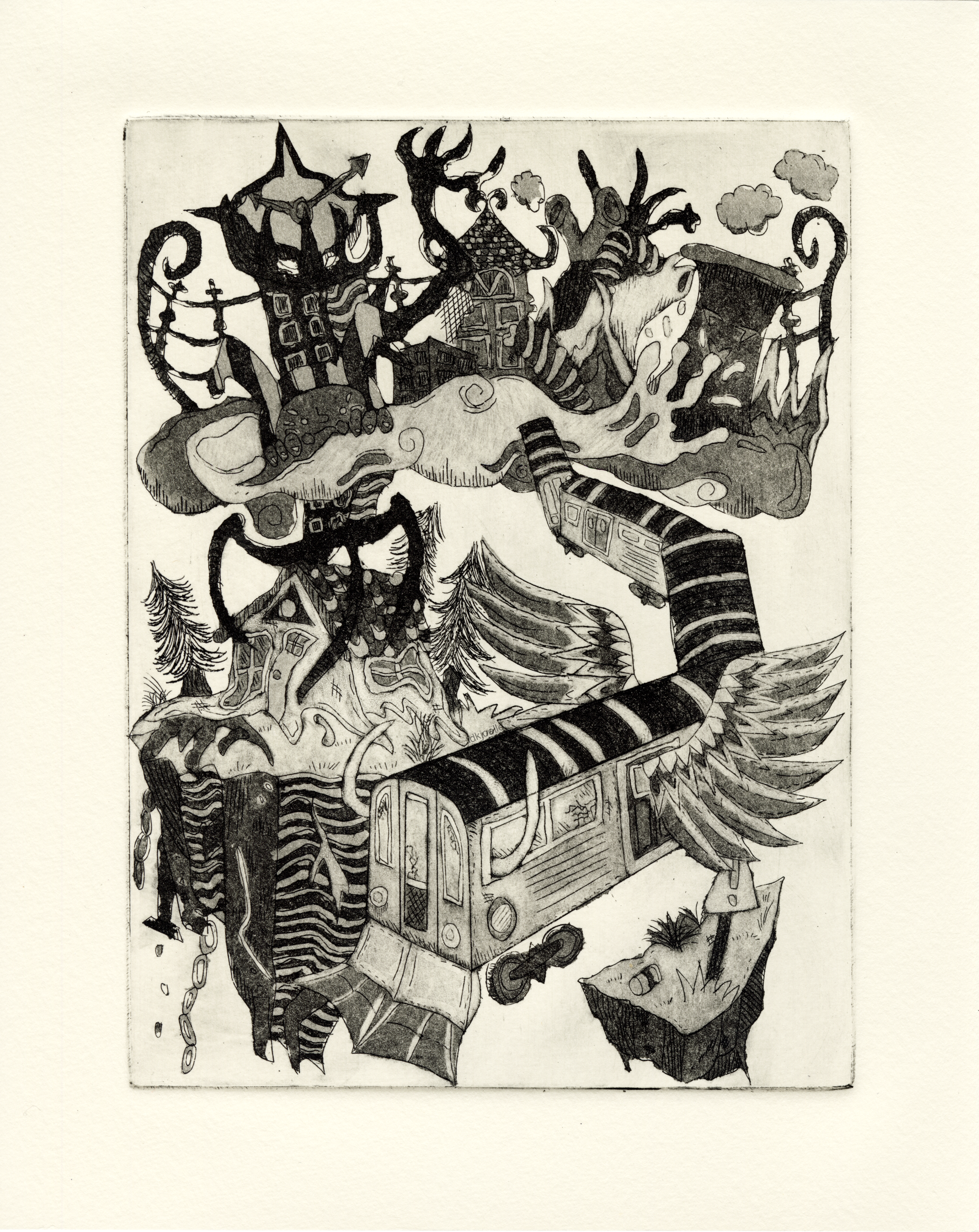 When I was younger, my grandma got sick and it led me to missing a lot of school while my mom navigated us through multiple hospitals in Chicago. I didn't understand the purpose of these trips at the time, but I admired the noise of CTA cars bustling through stations and the continuous rain that fell from the skies above. The goal was to capture the feeling of a decaying modern world so I decided to use a copperplate to incorporate shades of gray to reinforce the melancholy feel.